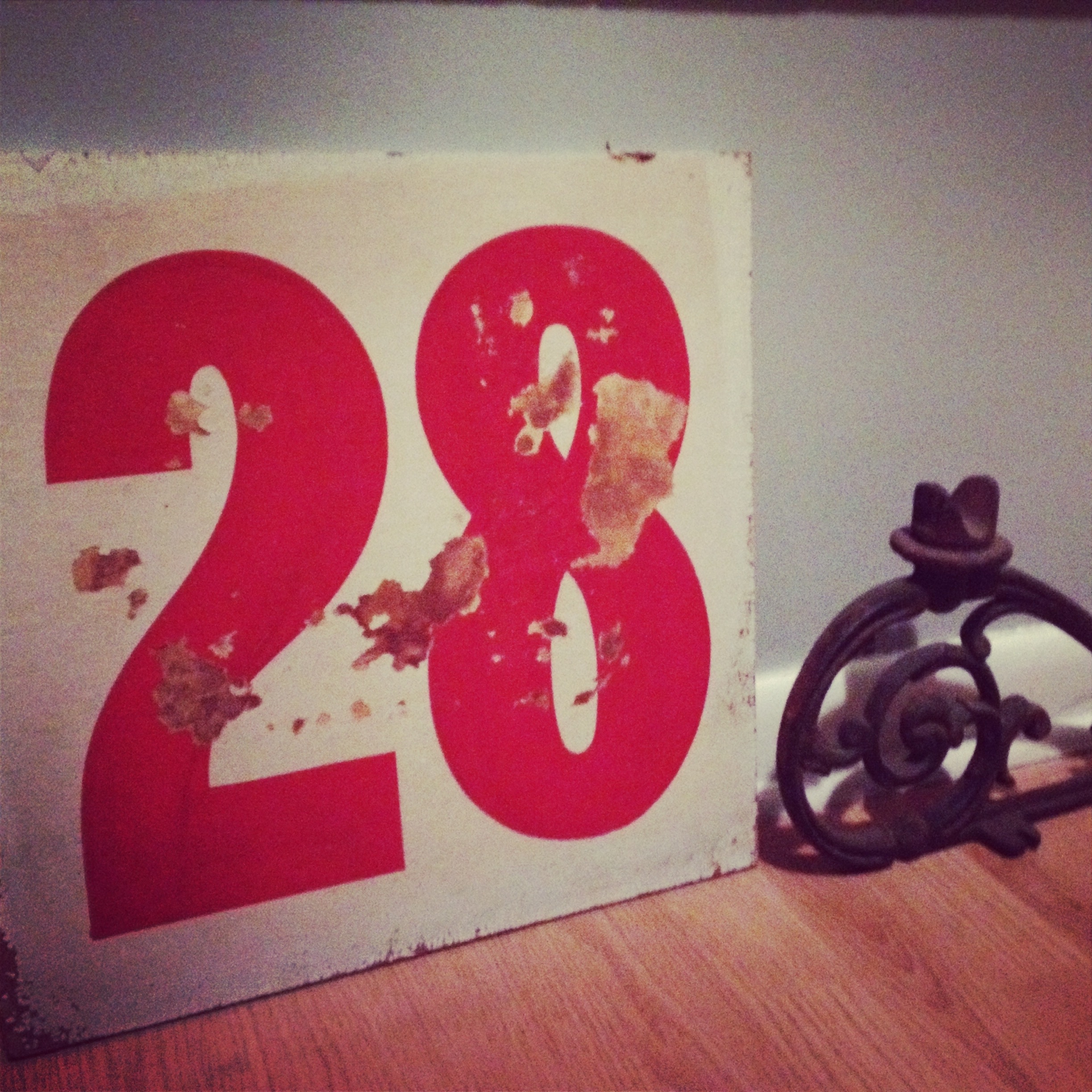 And…this quaint little “tobacco farm sign” as it was labeled, with our anniversary day on it! This gem is double sided and boasts one side in very good condition as well as this wonderfully chippy side…best of both worlds when it comes to piddlin’ finds! Believe it or not it was also {$28-}!
